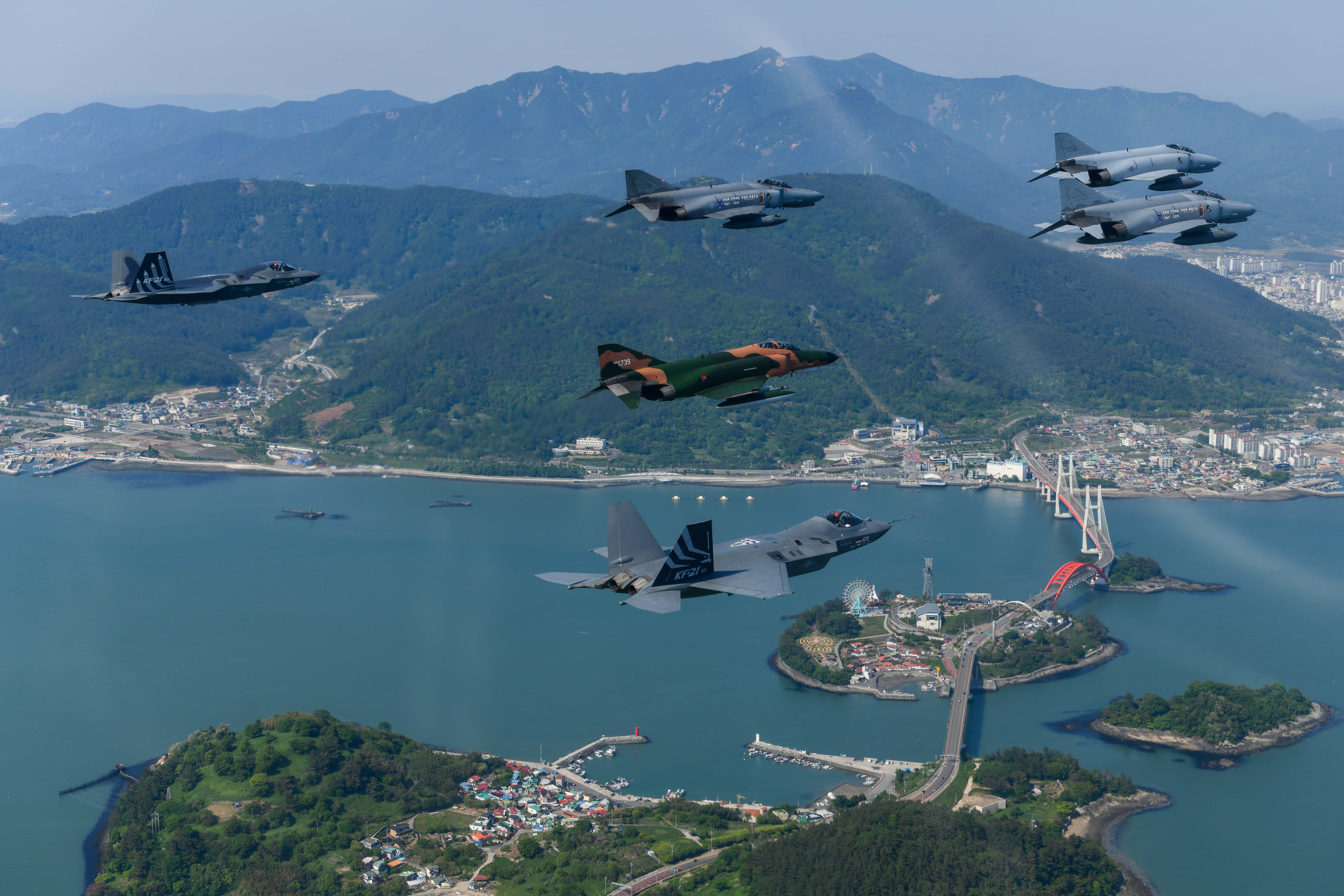 필승편대와 KF-21 전투기가 편대를 이루어 삼천포 상공을 비행하고 있는 모습필승편대와 KF-21 전투기가 편대를 이루어 사천대교 상공을 비행하고 있는 모습필승편대와 KF-21 전투기가 편대를 이루어 삼천포대교 상공을 비행하고 있는 모습필승편대와 KF-21 전투기가 편대를 이루어 비행을 실시하고 있는 모습필승편대와 KF-21 전투기가 편대를 이루어 비행을 실시하고 있는 모습필승편대와 편대 비행 중인 KF-21 전투기가 피치아웃 하는 모습